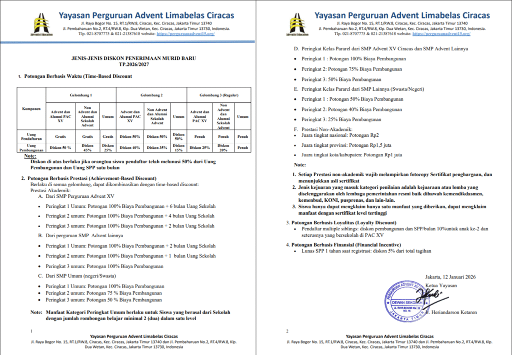 Biaya pendaftaran siswa SMA (Sekolah Menengah Atas) Perguruan Advent XV Ciracas baru maupun lama TP 2026/2027 dapat dilihat melalui tabel rincian berikut.